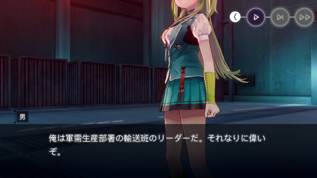 「あんたはだれだ」という五十鈴の問いに「軍需生産部署の輸送班のリーダー」だと名乗る。
