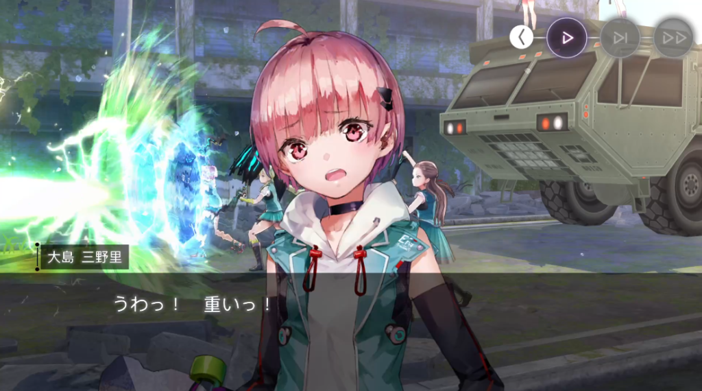 無防備な六宇亜と輸送車を守るため、すかさず五十鈴がデフレクタでフォローに入ります。慣れないことはすべきじゃないと、確実に攻撃を防げる方法で守り続けることにする31E。