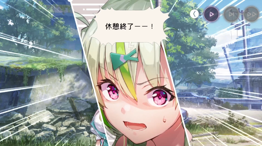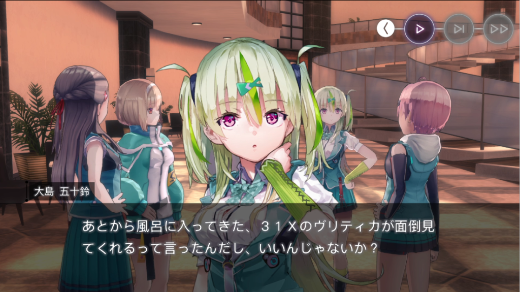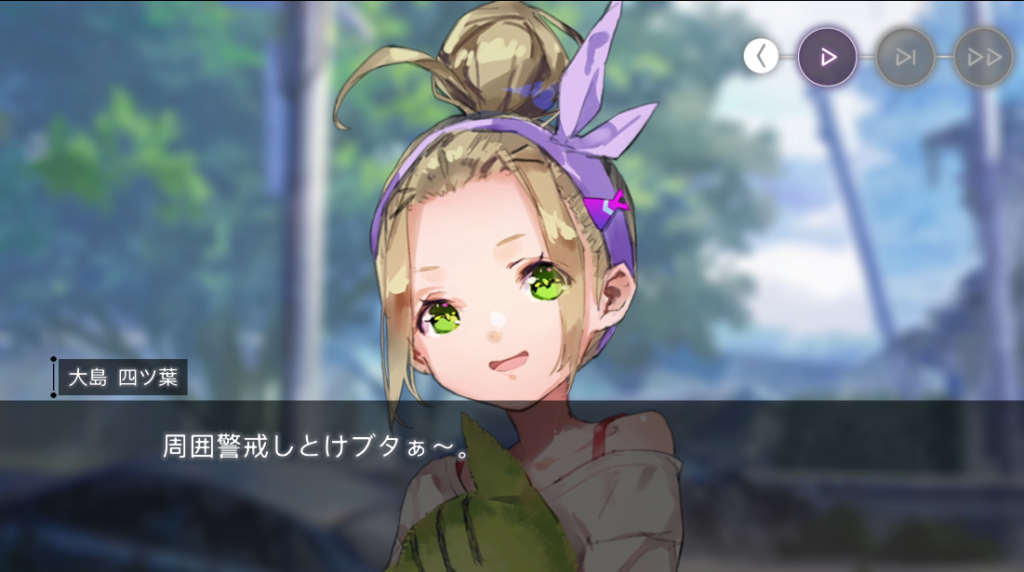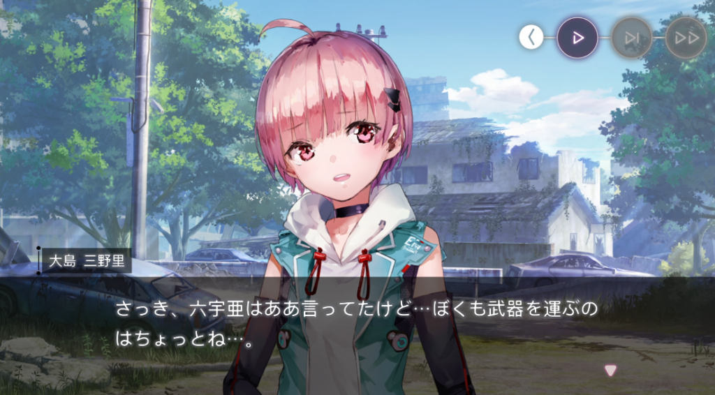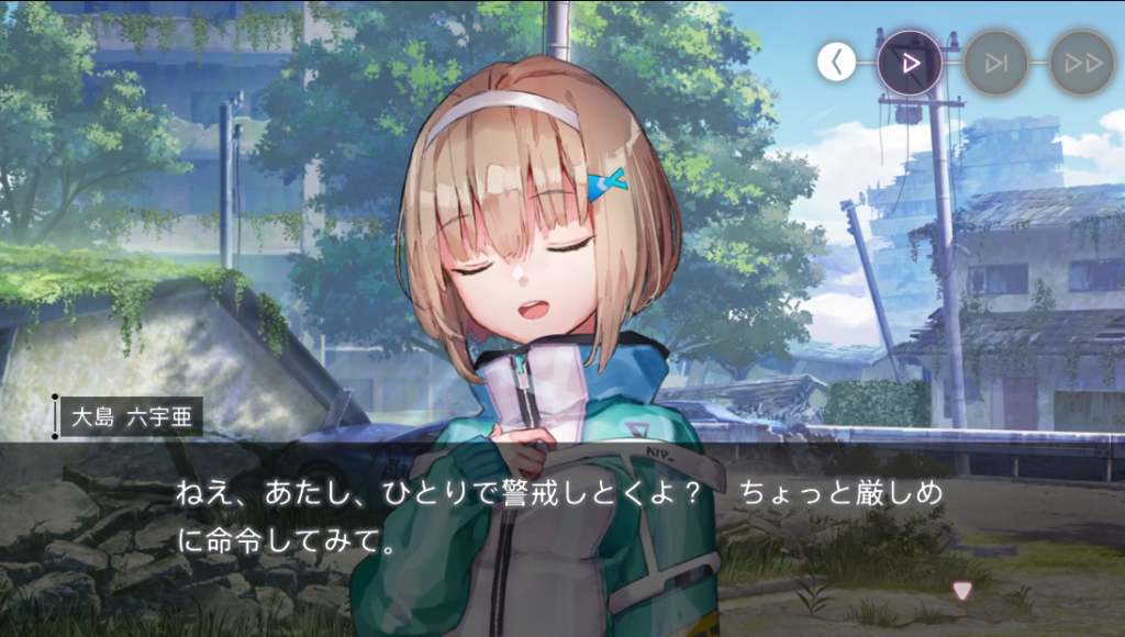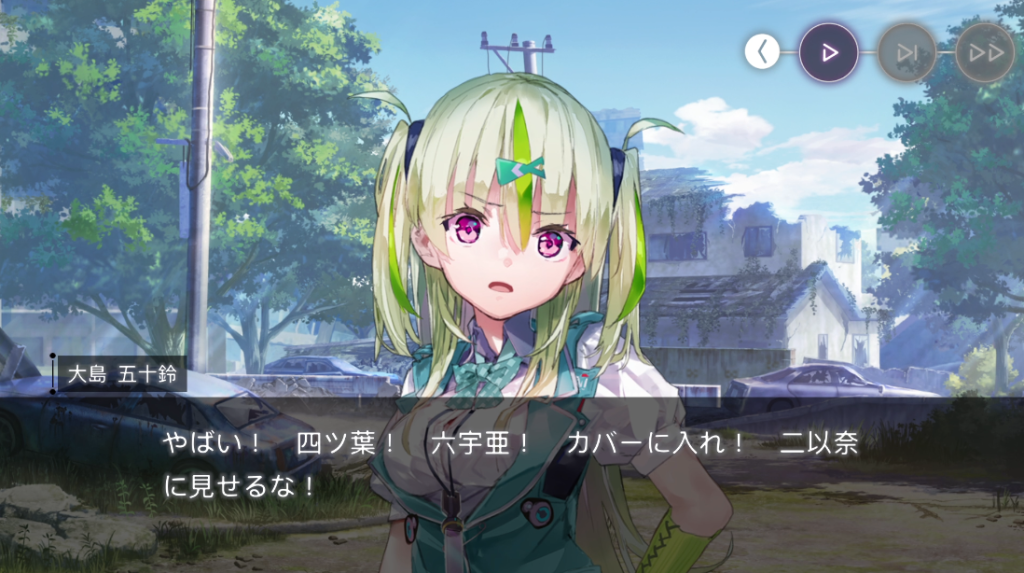 休憩しようと言い出す四ツ葉。二以奈は三野里の五十鈴に周囲警戒を命じます。そんな様子を気づかってか(気づかっていないようでもあるが)六宇亜はひとりで警戒すると言い出します。