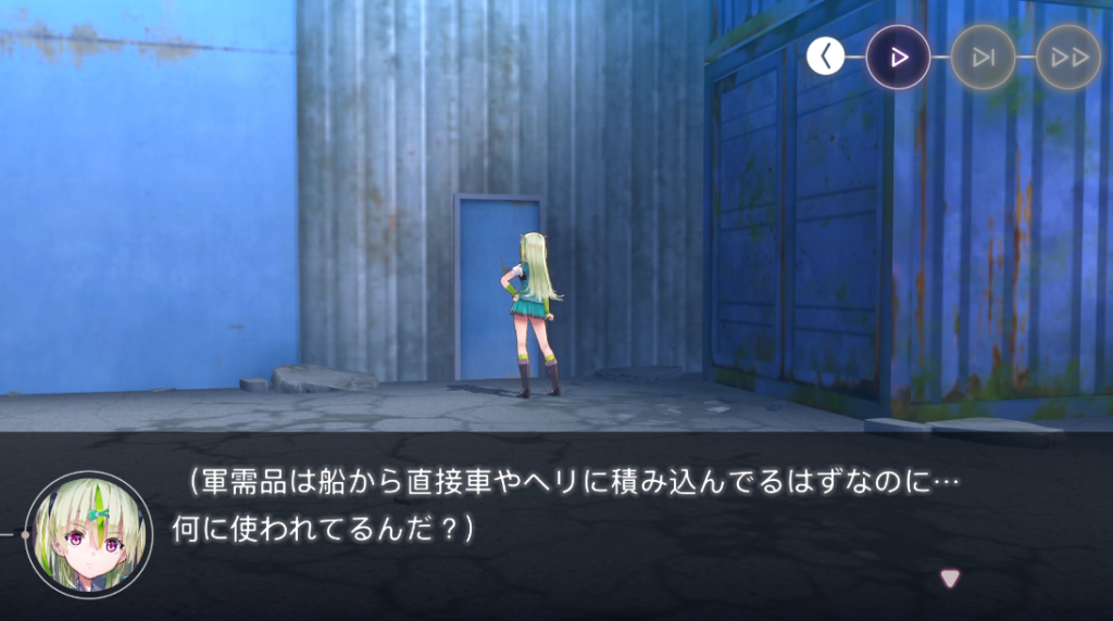 そんなこんなをしながら、軍需品を積み込んでいる間は個別哨戒することになります。地面に新しめのタイヤ痕を見つけた五十鈴は、鍵のかかった倉庫のドアにたどり着きます。
