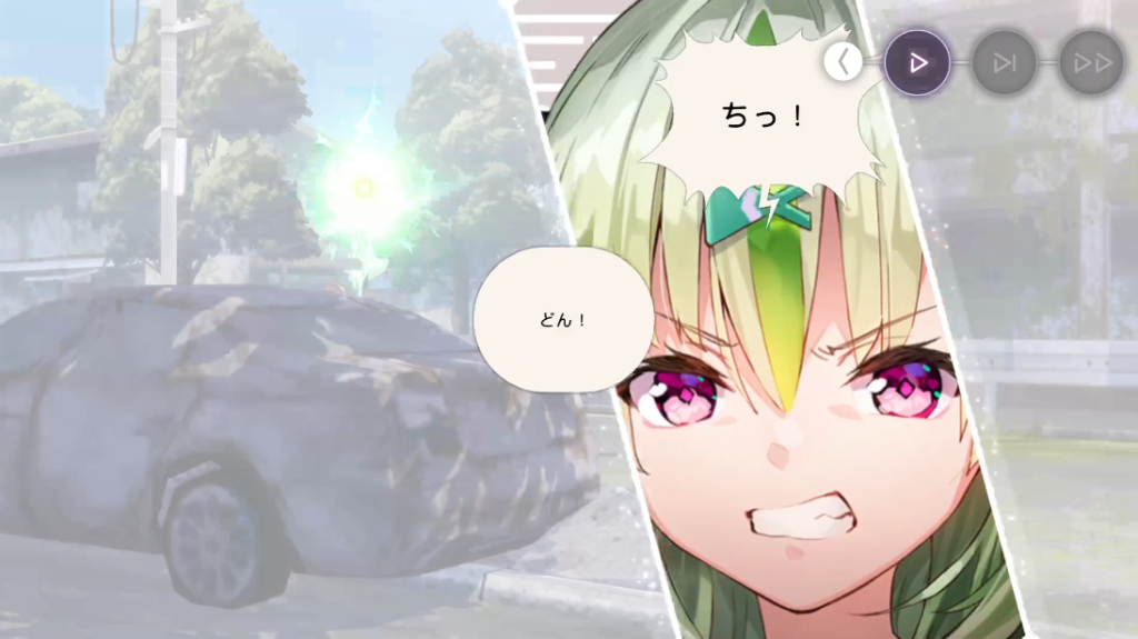 間一髪、敵の攻撃をかわすことができた二以奈と五十鈴でしたが、近くにあった車は跡形もなく吹き飛んでしまうほどの遠距離攻撃でした。(危険すぎる)